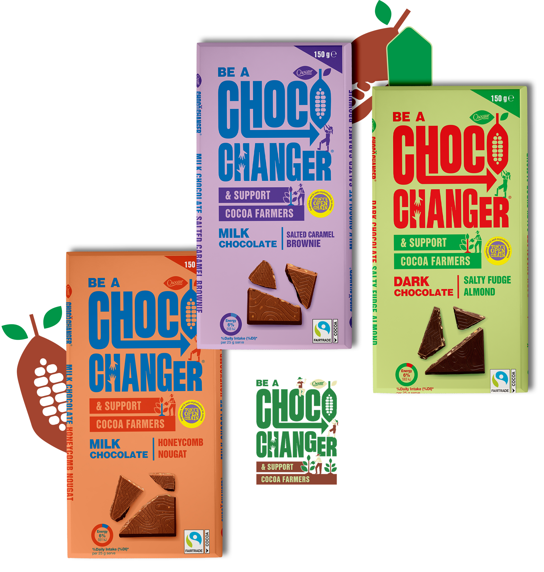 Die Choceur CHOCHO CHANGER Tafelschokolade besteht aus 100 % belgischer Schokolade. Der Kakao, der in unseren CHOCO CHANGER Tafelschokoladen verwendet wird, ist Fairtrade-zertifiziert.
